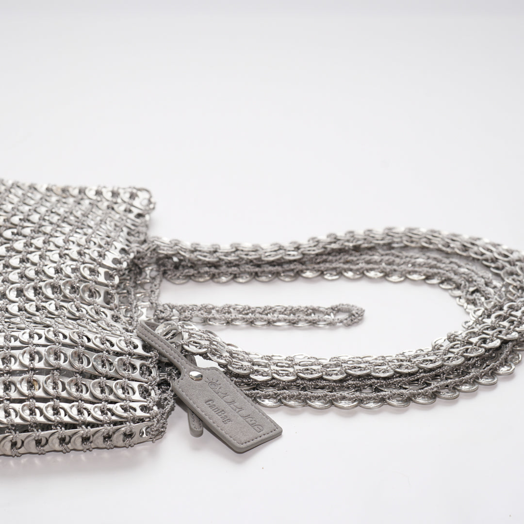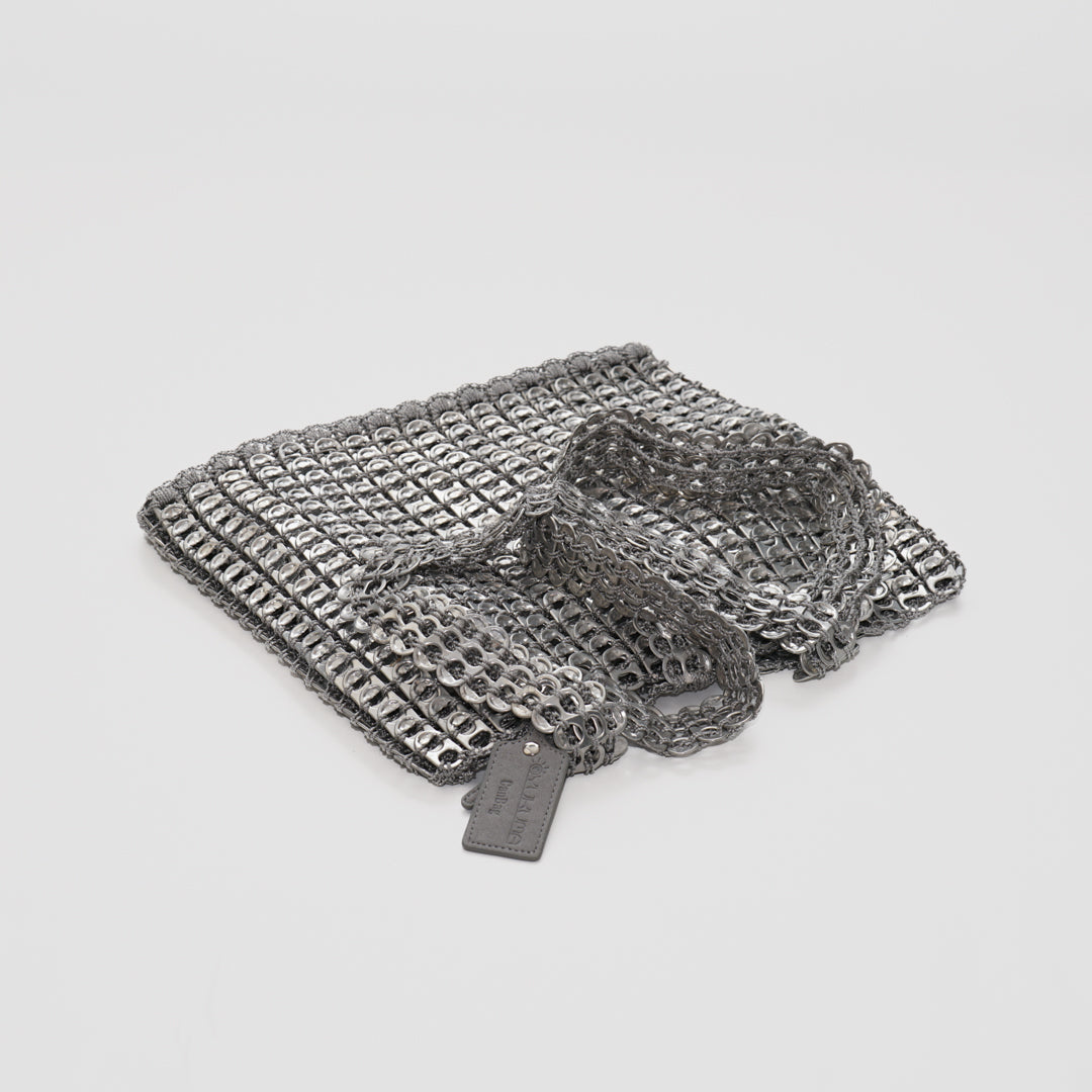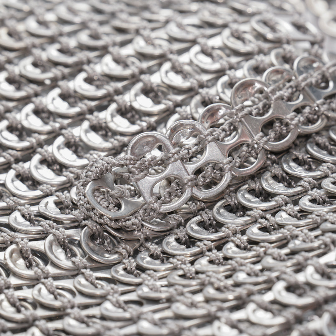Our bags are handcrafted in Brazil from recycled can tabs – each piece is one of a kind. The durable materials are resistant to water, heat, and sharp objects. For cleaning, simply wipe with a soft cloth.