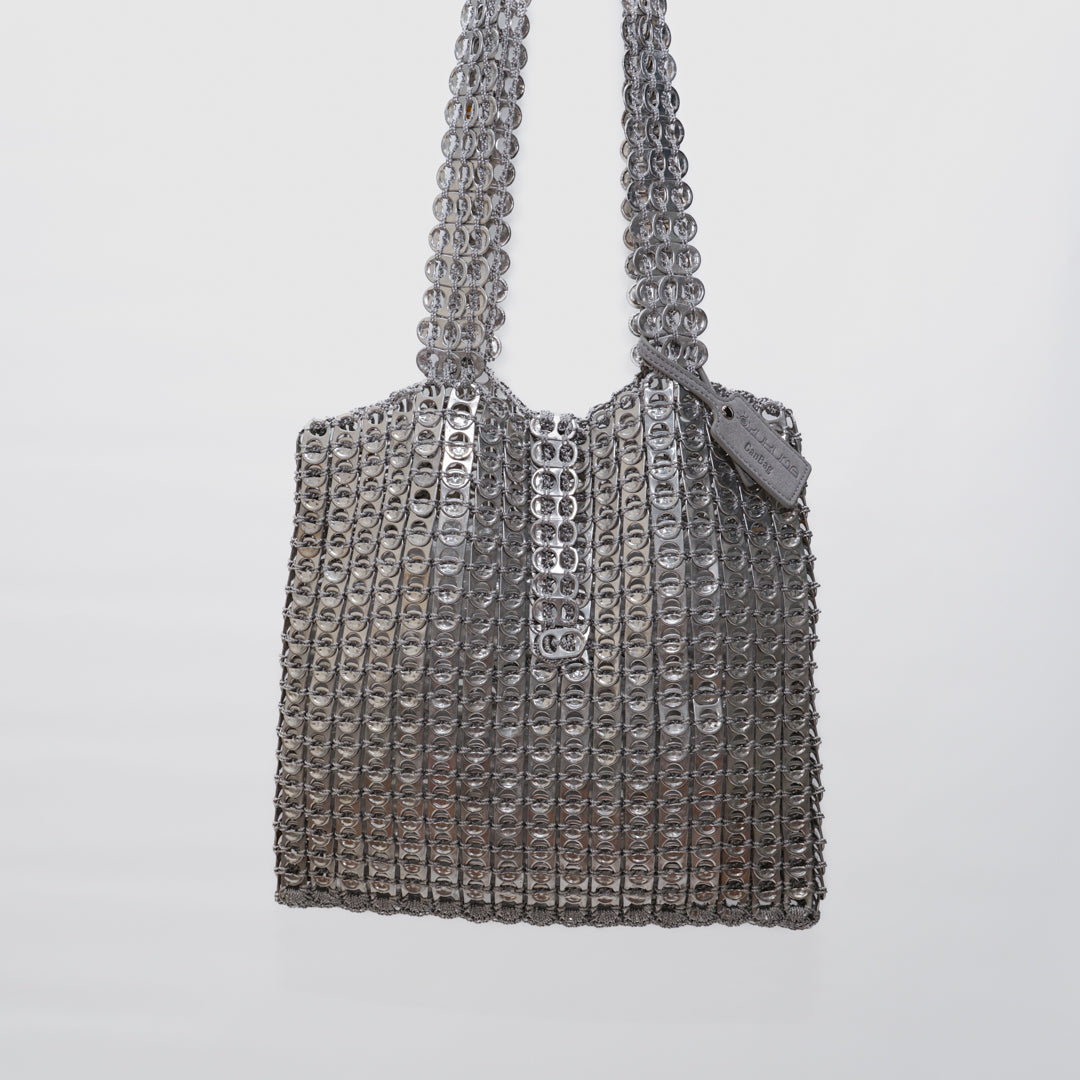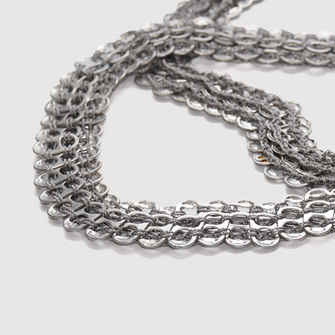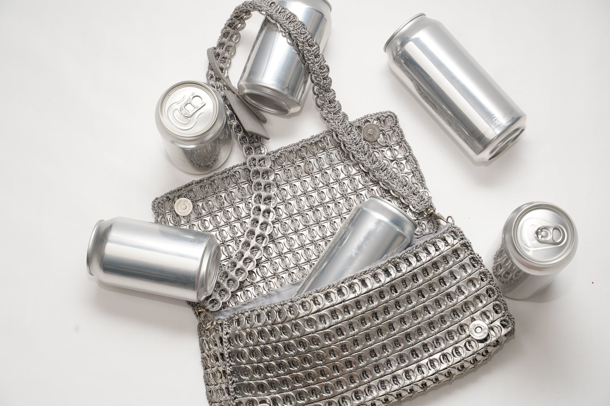 Our bags are handcrafted in Brazil from recycled can tabs – each piece is one of a kind. The durable materials are resistant to water, heat, and sharp objects. For cleaning, simply wipe with a soft cloth.